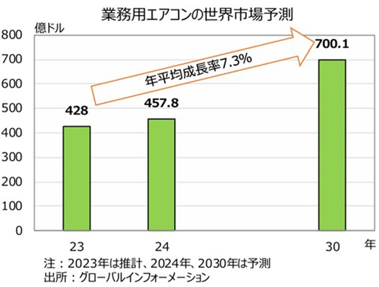 神様:日本国内の業務用エアコンの出荷は、バブル期の建設ラッシュとなった1990年代にピークを迎えました。しかし、その後は低下し続け、伸び悩んでいます。ファンコイルユニットやエアハンドリングユニットの国内出荷実績をみると、2020年にはピーク時の5分の1程度まで減少しています。一方で世界市場を見ると、業務用エアコン市場は2023年に428億ドルになったと推計されています。2024年は457.8億ドルと予測され、その後も年平均で7.3%の成長が見込まれる市場と考えられています。