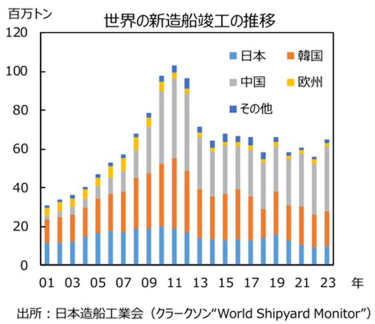 神様:さて、今日は船舶関連の企業に注目しましょう。現在、世界の海運・造船業界では大きな変化が起こっています。近年の世界の新造船竣工量は年間6,000万総トン前後で推移してきましたが、2024年1月~9月では前年同期比2割増で推移し、2024年は11年ぶりに7,000万総トン超の水準に回復する見通しです。