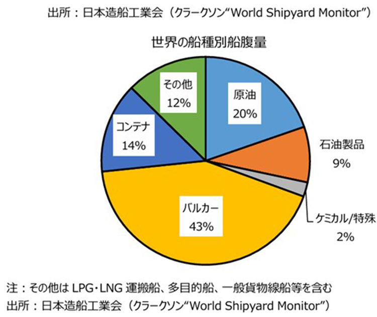 神様:しかし一方で、造船が完成するまでには長い時間がかかります。すぐに保有数、載貨重量トン数を増やすことが難しければ、既存の船の設備を整備する需要が拡大していくことが考えられます。日本は船舶装備品などでは世界的に高いシェアの製品分野が多くありますから、ここは期待したいところです。また、世界の「船種別船腹量」を見ると、約半数近くが「バルカー」と呼ばれる「ばら積み貨物船」が占めています。「ばら積み」とは積み荷を梱包せずに運ぶことですが、バルカーでは主に鉄鉱石、石炭や穀物などを運びます。景気が良好な際は、石油等のエネルギーや鉄鉱石等の資源需要が上向くことが考えられ、輸送量が増えることも予想されるでしょう。