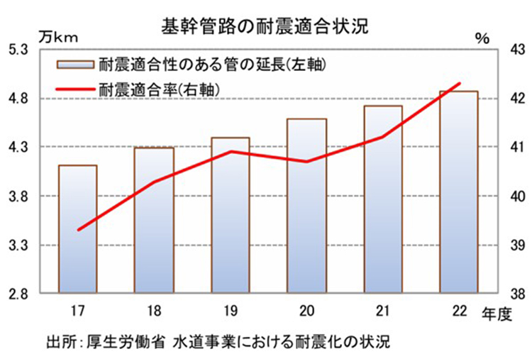 神様:その通りです。一方で、1年間でどれだけ水道管の更新を行ったかを示すのが「管路更新率」です。こちらは年々低下していることが分かっています。また、2022年度における水道インフラを支える基幹管路のうち、耐震性のある水道管の割合は42.3%に過ぎません。耐震適合性のある水道管への更新が進み、総延長距離は増加していますが、地震に対する備えは十分とは言えません。