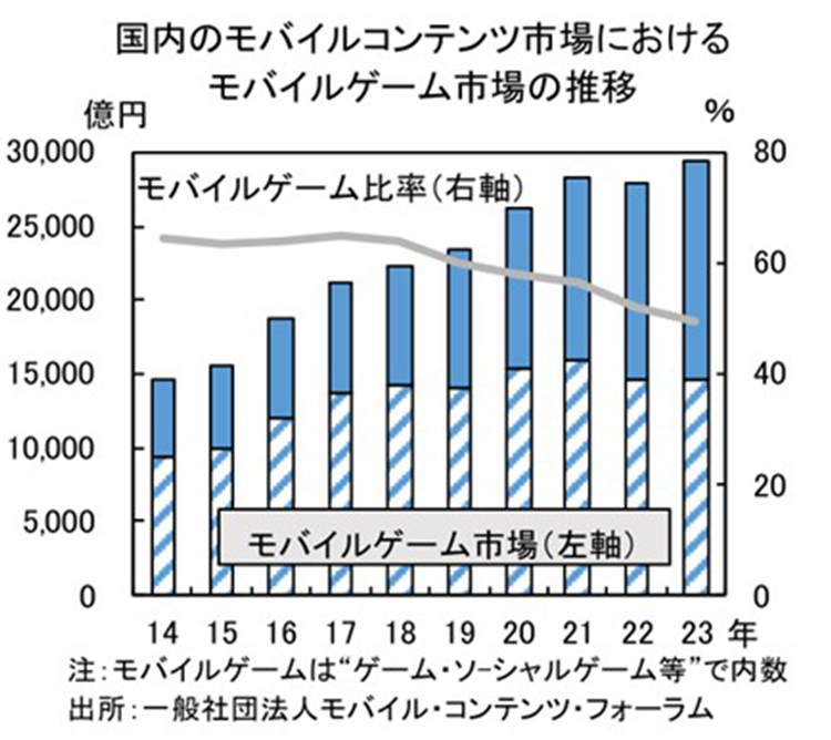 神様:以前はSNSやブラウザ上で他のプレイヤーとコミュニケーションを取りながら遊ぶゲームをソーシャルゲーム、スマホでアプリをダウンロードして遊ぶゲームをスマホゲームなどと呼んでいましたが、現在は境界があいまいなところもあるようです。ソーシャルゲームでもアプリをダウンロードして遊ぶものも多いです。最近の国内のモバイルコンテンツ市場を見てみましょう。市場全体は順調に拡大していますが、そのけん引役はゲームではなく、動画、エンタテインメントや音楽コンテンツです。ゲームはコンテンツの中で最大の割合を占めるカテゴリーではありますが、全体に対する割合は右肩下がりに縮小する傾向が続いています。