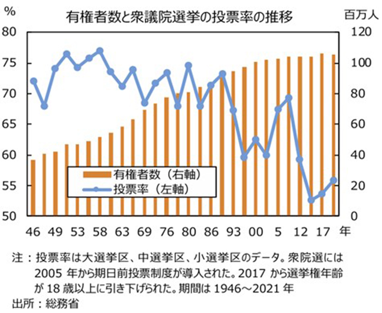 神様:総務省による有権者数と衆議院選挙の投票率の推移を見ると、有権者数は右肩上がりで増加していますが、投票率は時々上昇することがあるものの、全体的には右肩下がりであることが分かります。一般的に投票率が下がるほど、選挙に民意は反映しにくくなります。民主主義の健全な発展のためにも投票率を上げることは克服すべき課題です。