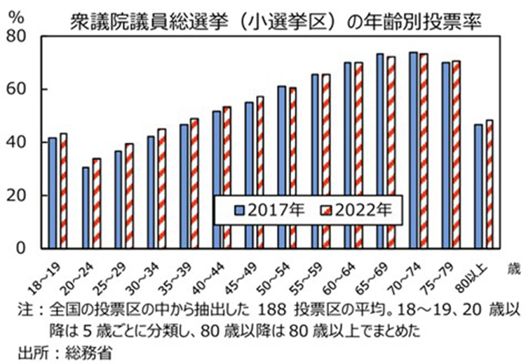 神様:期日前投票により、働く世代が投票しやすくなりました。2022年の衆院選では、投票率換算で20%程度の人が期日前投票を利用しました。しかし、衆院選(小選挙区)の年齢別投票率を見ると、若者世代の投票率がまだまだ低いことが分かります。今後も時間帯や設置場所の工夫を行っていくことが大切です。