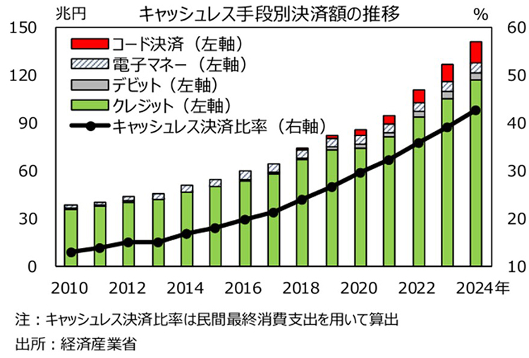神様:現代ではすでに多くの人々がキャッシュレスの便利さを体験しています。経済産業省は3月31日、2024年の個人消費に占めるキャッシュレス決済比率を発表しました。2024年のキャッシュレス決済比率は42.8%となり、政府の目標であった「2025年6月までにキャッシュレス決済比率を4割程度とすること」を前倒しで達成しました。金額ベースで見ると実に141兆円です。