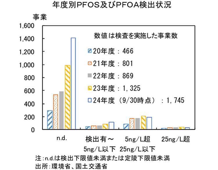 神様:しかし、2024年9月30日時点で、全国1,745事業の約2割に当たる332事業でPFASが検出されました。環境省が4月25日に公表した公共用水域及び地下水の「PFOS及びPFOAの水質測定結果」では、39都道府県、2,078地点(河川:981地点、湖沼:37地点、海域:99地点、地下水:961地点)が調査され、そのうち22都府県、242地点(河川:56地点、湖沼:0地点、海域:0地点、地下水:186地点)で国の目標値を超過していることが確認されました。