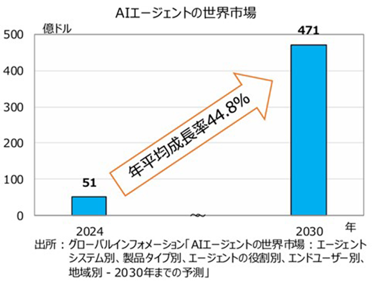神様:AIエージェントの市場規模はまだまだ小さいですが、今後大きく伸びることが予測されています。グローバルインフォメーションによれば、AIエージェントの市場規模は2024年の51億ドルから2030年には471億ドルになり、年平均44.8%で成長すると予測されています。主に業務などの自動化、効率改善につながるようなコスト削減の目的、活動を合理化する目的でAIエージェントの導入が進んでいくと考えられています。
