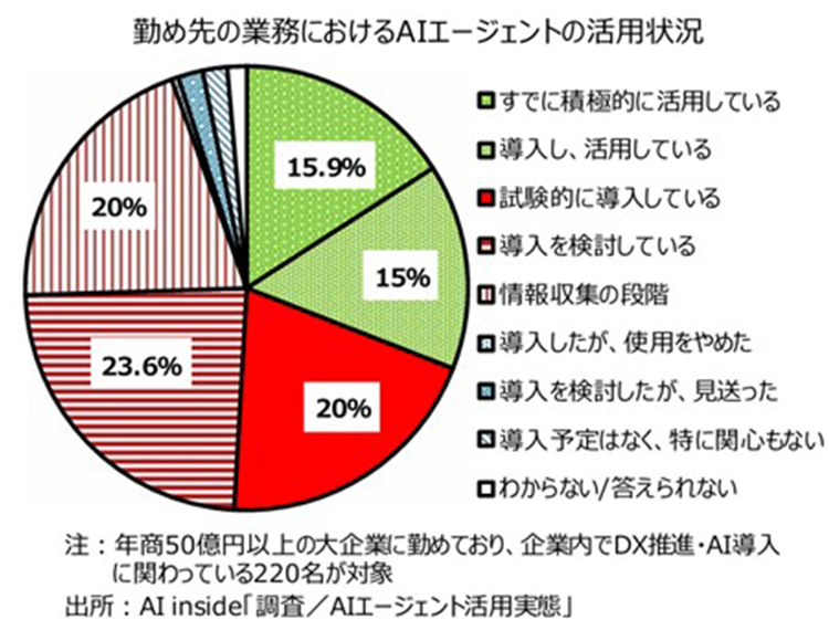 神様:おっしゃる通りです。しかし、導入はまだこれからです。あるアンケート調査によれば、AIエージェントを活用していると回答した割合は全体の30.9%でした。一方で、試験的な導入や導入の検討、情報収集を実施している割合は63.6%となり、関心の高さが伺えます。