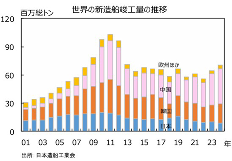 神様:その通りです。最近公表された2024年の世界の新造船竣工量によると、前年比で8.5%増となる7,040万総トンであることがわかりました。世界の新造船受注は1.38億総トン程度と過去2番目の水準まで拡大し、受注残も積み上がっている状況です。