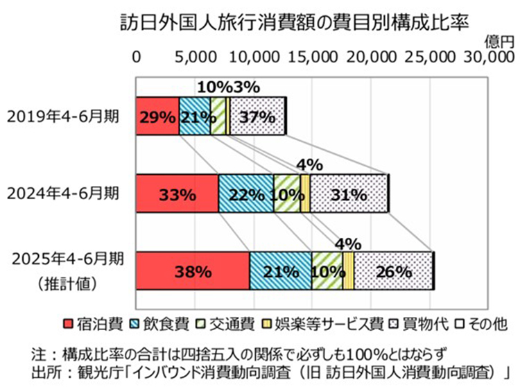 神様:その前に、観光庁が発表した2025年4~6月期のインバウンド消費動向調査を見てみましょう。調査によると、旅行消費額(推計値)は前年同期比で18%増となる2兆5,250億円となりました。費目別に構成比率を見ると、買物代が26%と2024年の31%、コロナ禍前の2019年の37%と比べて低下傾向にあります。その一方で、宿泊費は38%と2024年の33%、2019年の29%と比べて上昇し、宿泊費が消費のメインとなっていることが分かります。