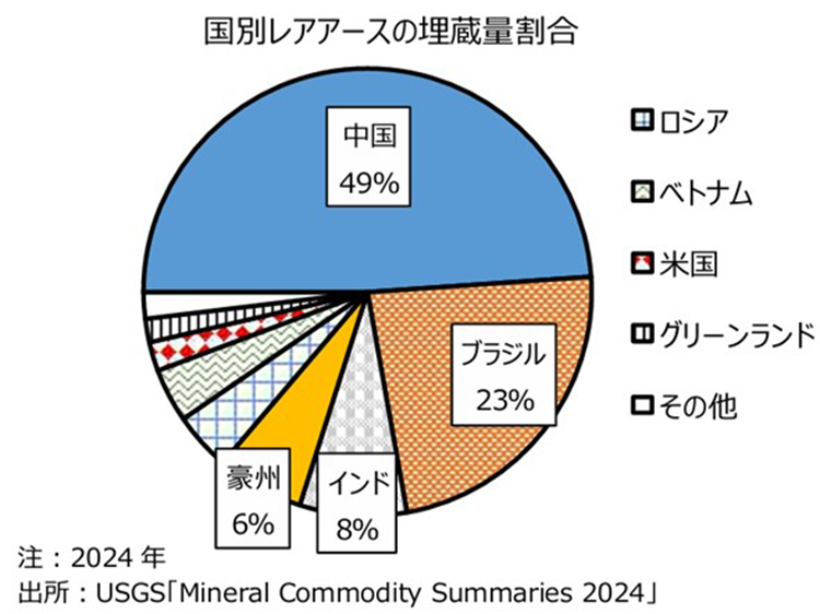 神様:レアアースはスカンジウム、ネオジムなど、17種類の元素の総称を言います。産出量が少なく、抽出が難しいレアメタルの一種であり、スマートフォン、電動自動車や再生可能エネルギーの発電設備などの製造に欠かせない貴重な資源です。一方で、例えば国別レアアースの埋蔵量割合を見ると1位は中国で49%と、他国に比べて大きな割合を占めています。レアアースが特定の地域に偏在しているため、時として外交カードに利用されることがあります。