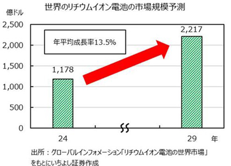 神様:さて、グローバルインフォメーションによると、リチウムイオン電池の世界市場規模は2024年の1,178億ドルから2029年には2,217億ドルに達すると予測されています。この間、年平均成長率は実に13.5%です。今後のリチウムイオン電池市場の成長に期待しましょう。