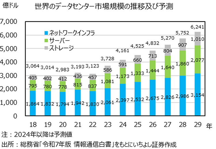 神様:今後の新総裁によるインフレ対策や景気拡大政策に注目し、株式市場の追い風に期待したいところです。さて、今日はデータセンターについてお話しましょう。総務省は7月に「令和7年版 情報通信白書」を公表しました。世界のデータセンター市場は、2024年に4,161億ドルと見込まれていますが、2029年には6,241億ドルまで拡大する見通しです。
