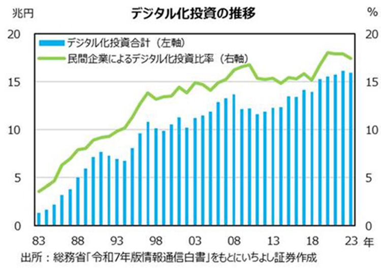 神様:積極財政、金融緩和継続の政策実現への期待を反映した「高市トレード」が株価を押し上げています。今後は「サナエノミクス」の政策実行性に焦点が向かい、物価対策や景気対策の具体的な効果や内容を見極める段階に遷移していくでしょう。さて、企業のデジタル投資も加速しています。2025年9月の日銀短観によると、大企業・中堅企業・中小企業の全規模合計の全産業による2025年度(計画)のソフトウェア投資額は、前年度比で12.9%増加する見込みです。人手不足や生産性向上の課題を背景に、各企業でDXへの取り組みが盛んに行われている状況が明らかになっています。