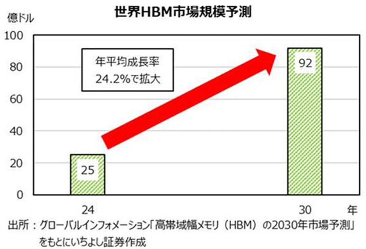 神様:グローバルインフォメーションによると、世界のHBMの市場規模は2024年で25億ドルでしたが、年平均成長率24.2%で拡大し、2030年には92億ドルに達する見込みです。今後のHBM市場のさらなる拡大に期待しましょう。