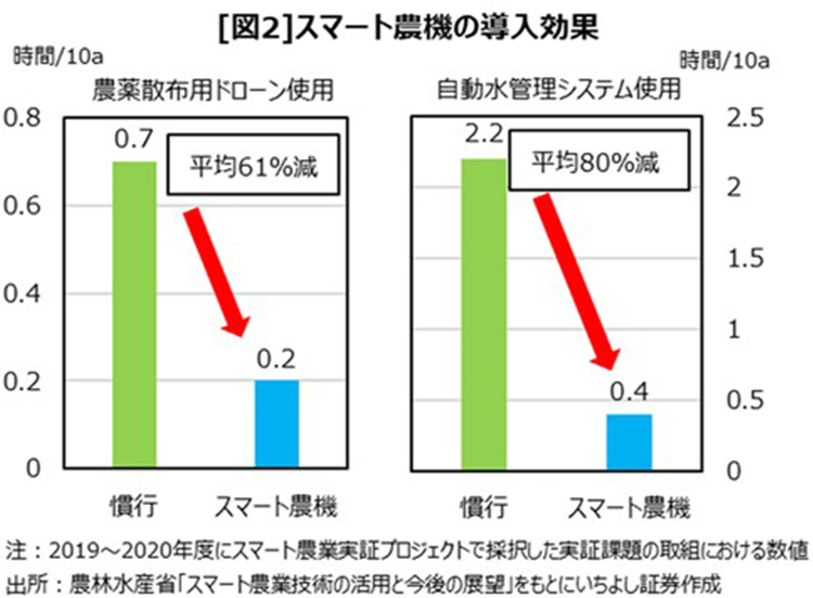 神様:その通りです。2020年時点で後継者のいない農業従事者は約70%とされており、JAでは2030年には基幹的農業従事者は83万人に、2050年には36万人になると予測しています。したがって、今後の農業は機械やデータを活用した効率化が大きなテーマとなります。例えば、ドローンで農薬散布を行うことで作業時間が平均で61%削減でき、自動水管理システムでは平均で80%削減できた実績があります。これらの効果はインターネット上の「スマ農成果ポータル」で随時公開されています。