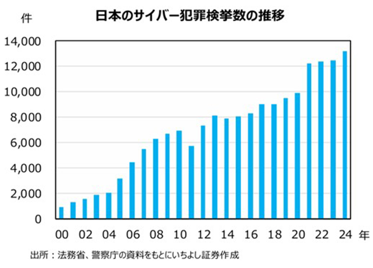 神様:今日は情報セキュリティについて話しましょう。近年はサイバー犯罪が増加の一途をたどっています。警察庁によると、2000年のサイバー犯罪の検挙総数は913件でしたが、2024年には13,164件まで増加しました。そして2025年は、ランサムウェアによるサイバー攻撃が社会に大きな影響を与えました。