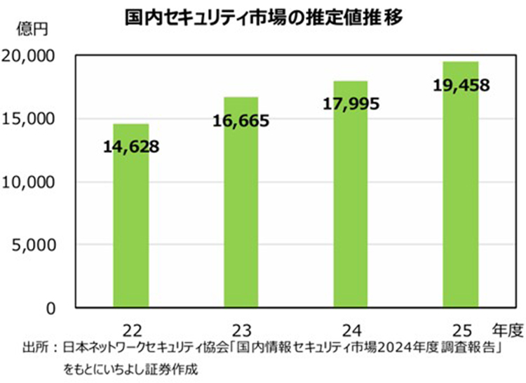 神様:その通りです。日本の情報セキュリティ市場はまさに拡大傾向にあります。日本ネットワークセキュリティ協会(JNSA)によれば、2022年度のセキュリティ市場の推定値は1兆4,628億円でしたが、2025年度には1兆9,458億円に達すると予測されています。今後の情報セキュリティ市場では、ウイルス対策ソフトやファイアウォール製品などのツール市場の成長が市場全体をけん引し、そこに付随する形でコンサルティングやセキュリティ監視などのサービス市場が伸びると予測しています。