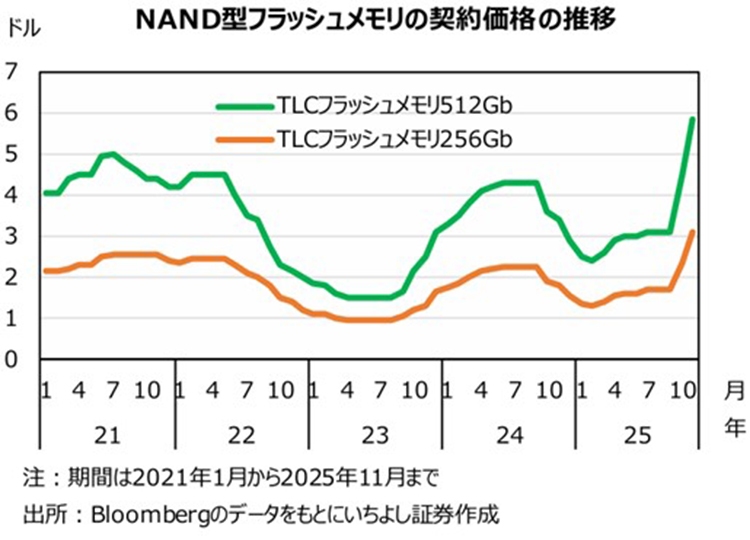神様:NAND型フラッシュメモリは、電源を切った状態でもデータが消えない「不揮発性メモリ」のひとつです。PCなどでデータの蓄積に使用され、HDD(ハードディスクドライブ)より高速で故障に強いと言われるSSD(ソリッドステートドライブ)もNANDです。足元のNAND市場の中心となっているのは3ビット/セル(TLC)と言われるもので、2025年の年初から11月まで契約価格は実に2倍を超える上昇を遂げています。