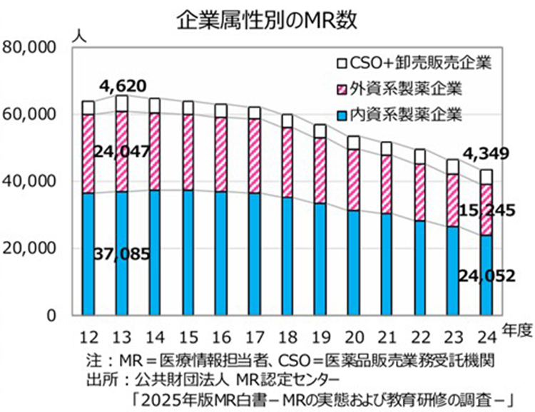 神様:その花形のMRの環境に大きな変化が訪れています。公益財団法人MR認定センターが公表する「MR白書」によれば、MRの数は2014年あたりから年々減少を続け、2024年度は2013年度の7割弱まで減少しています。