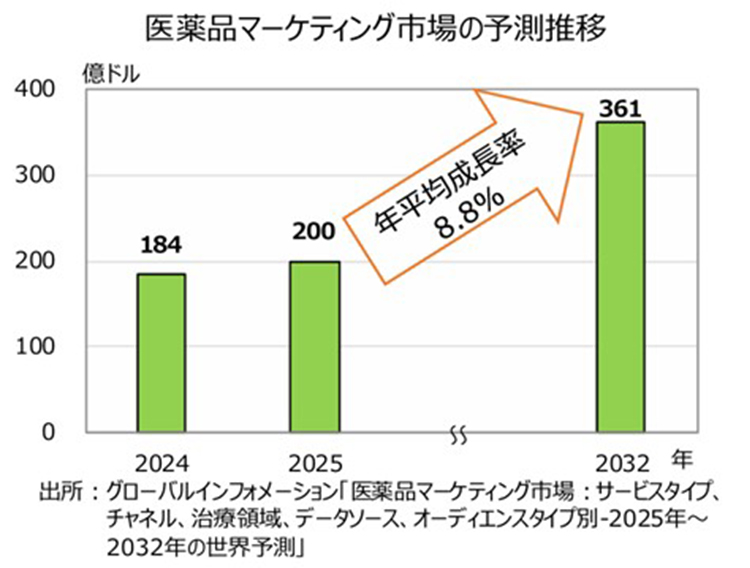 神様:おっしゃる通りです。製薬会社独自には対応しきれない部分については、マーケティングサービスを提供する企業に頼ることとなるでしょう。グローバルインフォメーションによれば、医薬品マーケティング市場は年平均成長率8.8%で成長し続け、2032年には361億ドルの市場規模に成長すると予測されています。激化する医薬品開発競争の中、医薬品マーケティングの関連企業にとっては大きなチャンスとなるでしょう。