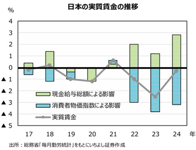 神様:家計も厳しい状況が続いています。厚生労働省は2月9日、2025年分の毎月勤労統計調査結果(速報)を公表しました。2025年の現金給与総額は5年連続でプラスとなった一方で、物価を反映した実質賃金は1.3%減となり、4年連続でマイナスです。実質賃金マイナスの中、有効な施策が望まれるところです。