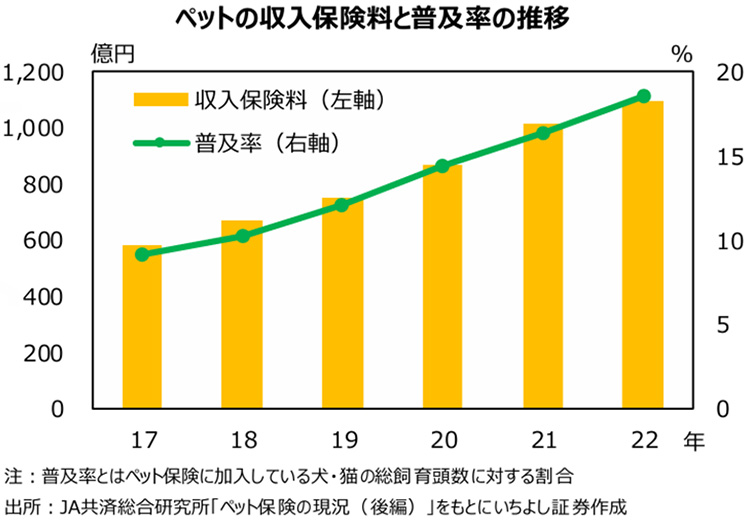 神様:おっしゃる通りです。そんな愛する家族に十分な治療を施せるように保険に加入する人も増えています。ペット保険の収入保険料の推移を見ると、2017年度は581億円でしたが、2022年度には1,098億円と2倍近く増加しています。保険の普及率も9.1%から18.6%と大きく上昇しています。近年のペット市場では、ペットの高齢化や家族化を背景に、ペット医療市場や保険市場が拡大していると言えるでしょう。